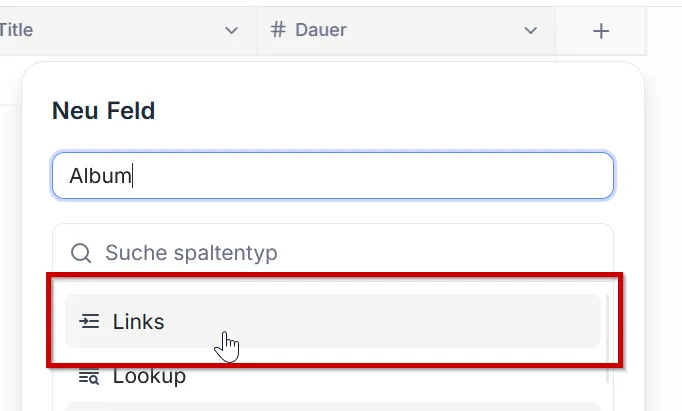 Füge eine Spalte hinzu und wähle hier den Typ “Link” aus: