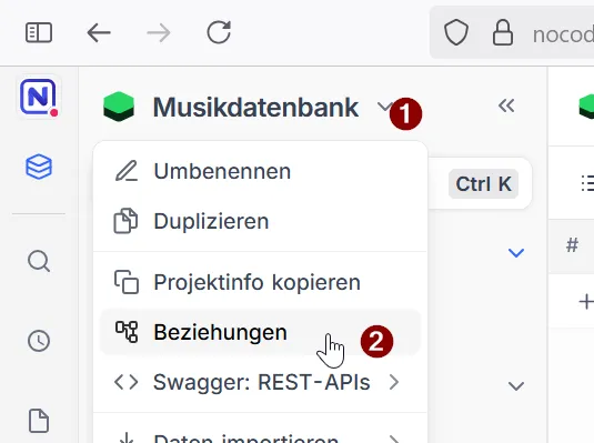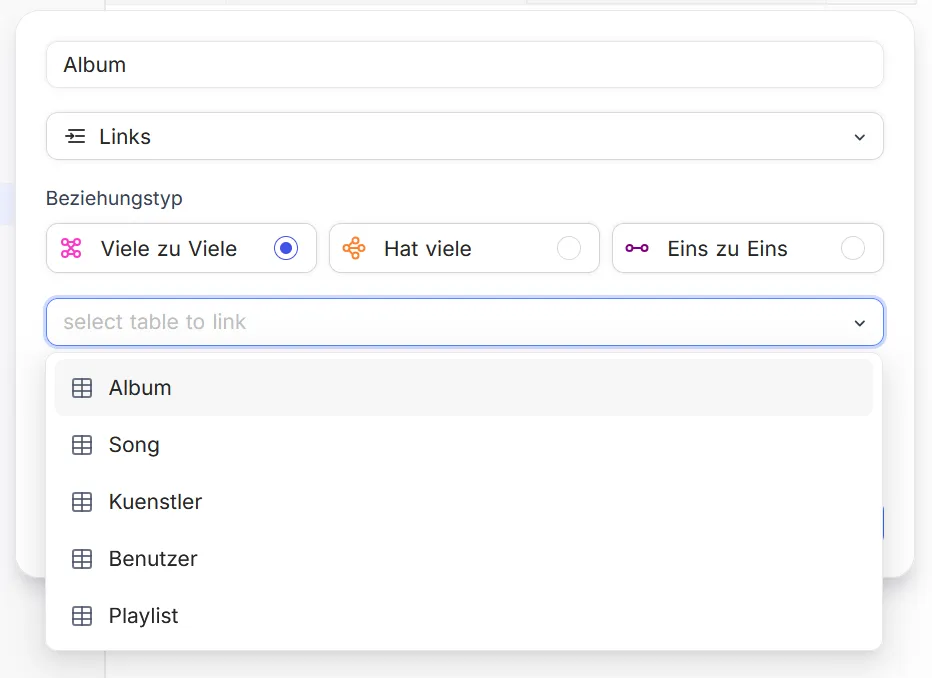 n:mmehrere Songs sind auf mehreren PlaylistWir gehen auf eine der beiden Tabellen und wählen “Viele zu Viele” aus.