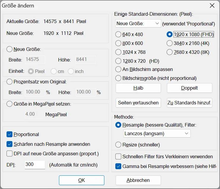 - Ändere die Größe des Bildes zuerst auf 1920x1080 und danach auf 640x480 Pixel.